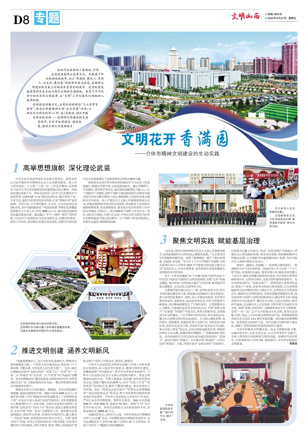 在汾河水滋养的三晋腹地,介休这座浸润着绵山忠孝文化、承载着千年古城韵味的城市,正以“举旗帜、聚民心、育新人、兴文化、展形象”的使命任务为画笔,在精神文明建设的长卷上勾勒出浓墨重彩的篇章。这里既有底蕴深厚的历史古迹与现代文明的交相辉映,更有千万市民用行动书写的文明故事,让“文明”二字如春风化雨般融入城市肌理。
