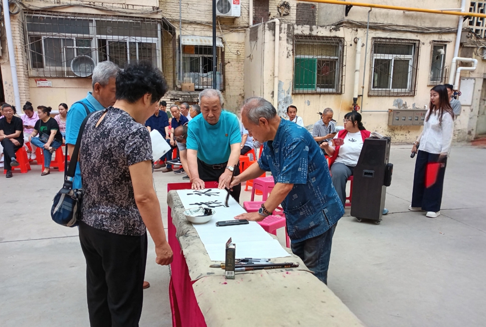 “书法不仅是中华文化的瑰宝,更是传递情感、凝聚邻里情谊的纽带。”社区书法班的学员们以笔墨为媒,现场挥毫写下“和谐社区”“初心如磐”等作品,并向居民讲解书法中蕴含的处世哲学。70多岁的书法班郭老师和书法班班长王源将“永远跟党走,邻里一家亲”的作品赠予社区和居民,用传统艺术架起邻里沟通桥梁。