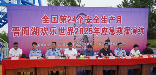 文明山西网讯 为强化特种设备安全监管,提升突发事件应急处置能力,6月26日,太原市晋源区多部门联合在晋阳湖欢乐世界开展摩天轮应急救援演练。此次演练由大原市园林局、晋源区市场监督管理局、晋源区应急管理局、太原市国投城市运营有限公司主办,大原市顺达游乐有限公司、太原市特种设备协会承办,太原市市场监督管理局指导。