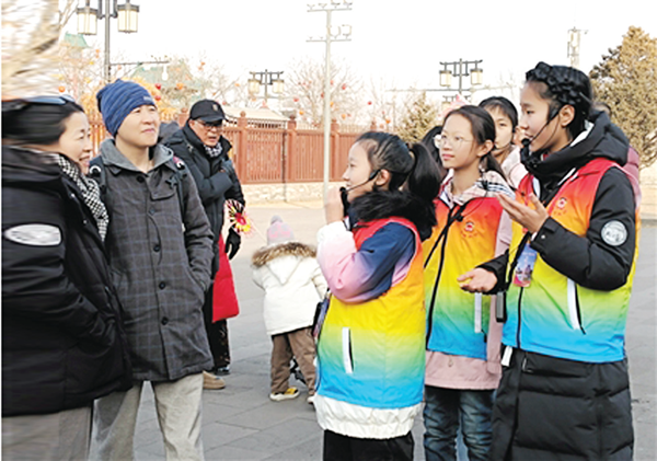 1月21日下午,来自平城区政协古城“向阳花”小小讲解员团队的晋依晨身穿色彩鲜艳的马甲、头戴麦克风、肩挂扩音器,为游客进行讲解。