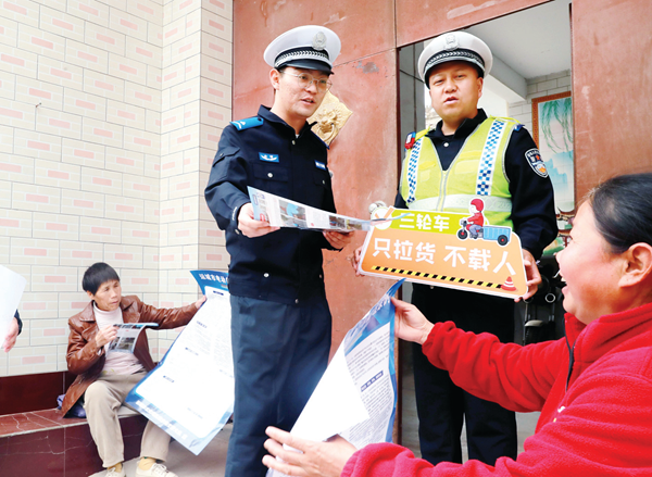 活动中,民警通过发放交通安全宣传挂图、彩页等方式,面对面向群众宣讲交通安全常识及相关法律法规,并结合春季农村交通出行特点,告诫群众骑乘摩托车、电动自行车戴好安全头盔,拒绝乘坐农用三轮车,不横穿马路、拒绝酒驾醉驾,共同营造良好的道路交通环境。图为当日民警宣传时的场景。