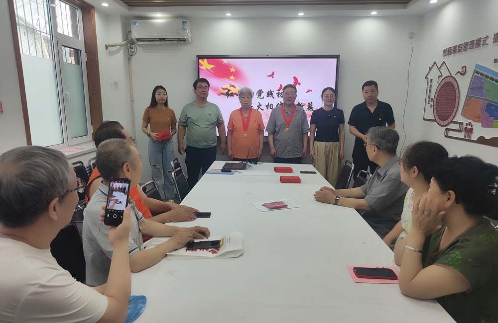 在90岁的老党员王宾录家中,社区党委成员为老人送上鲜花,与他围坐聊起入党往事。王大爷说“党没忘了我们这些‘老骨头’!我虽然走不动了,但只要能说话,就要给孩子们讲党的故事,让红色精神传下去!”
