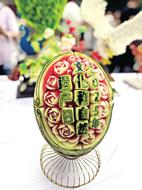 果蔬雕刻艺人在普通西瓜上刻出花。