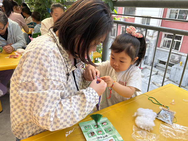 在编五彩绳环节,孩子们在家长的鼓励下大胆尝试,家长们则在一旁耐心辅助,随着五彩丝线在指尖翻飞,一条条寓意健康平安的五彩绳很快编织完成。当家长将五彩绳系在孩子手腕上时,传递的不仅是节日祝福,更是对中华优秀传统文化的传承接力。