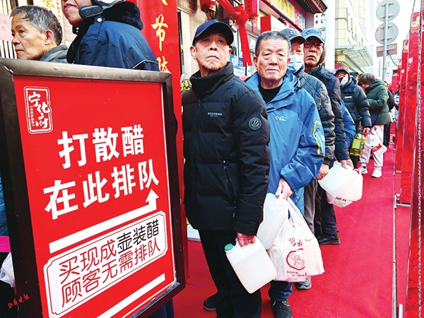 1月5日上午,喜爱“吃”醋的市民纷纷开始为腌制腊八蒜做准备,太原市迎泽区柳巷街头的百年老店太原宁化府门口,市民们排起长队,耐心等待着可以打上当天刚刚制作的热乎乎的老陈醋。