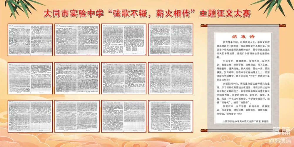 为了弘扬中华优秀传统文化,增强学生的文化自信,激发学生对传统文化的兴趣与热爱,高中语文名师工作室举办征文比赛。语文名师工作室组建评审团,依据内容深度、语言表达、创意新颖度等标准,对参赛作品进行公正评审。教师们积极参与指导,不仅帮助学生提炼主题、优化结构,还鼓励学生大胆创新,尝试新的写作手法。既提升了学生的文学素养和表达能力,又增强了他们的文化传承意识。