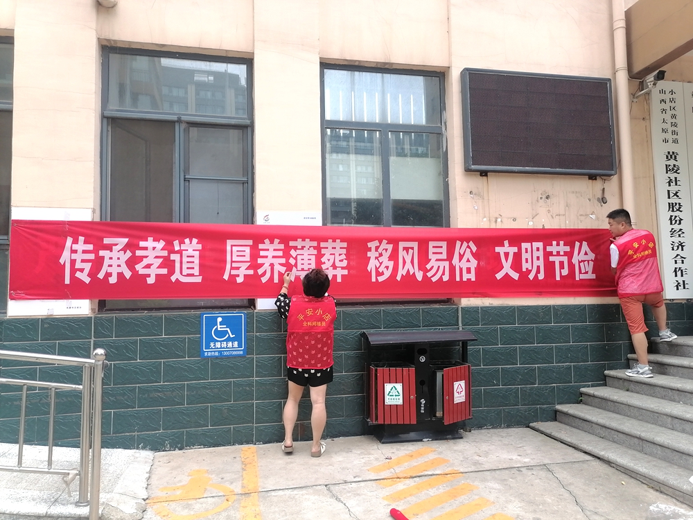文明山西网讯 “传承孝道 厚养薄葬 移风易俗 文明节俭”——太原市小店区黄陵街道黄陵社区的楼栋间、广场旁,这样的条幅格外醒目。近日,黄陵社区网格员向居民发放宣传扇,扇面印着“抵制婚假恶俗 提倡喜事新办”“抵制乱摆酒席 提倡节俭适度”等内容,让文明理念随清凉走进居民生活。