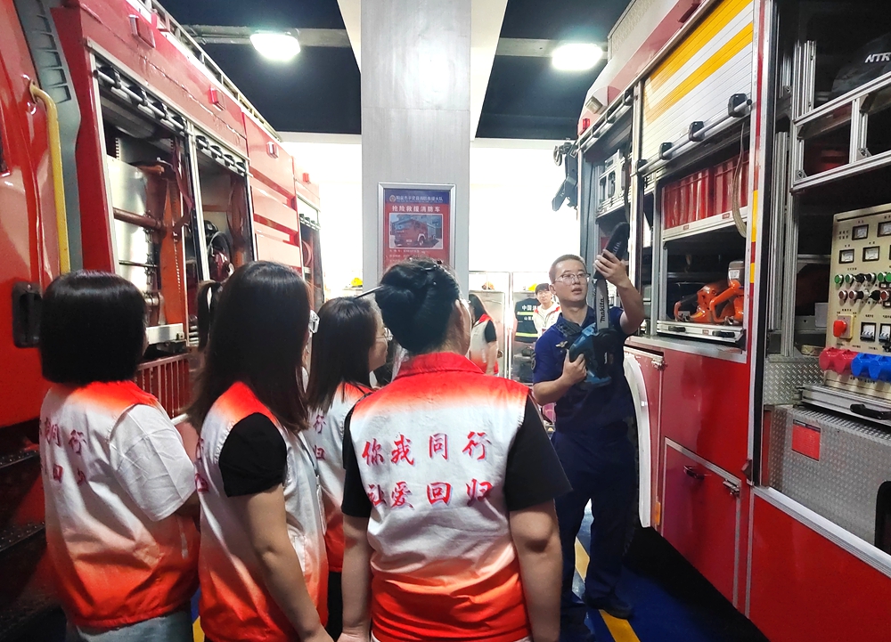 活动期间,消防员带领社工参观了消防车辆、器材装备,详细介绍了车辆器材的功能及应用场景,现场演示灭火个人防护装备穿戴、部分消防器材的使用和基本操作方法。同时,消防员还为大家进行了消防知识的讲解,就如何预防火灾发生、一旦发生火灾如何正确报警、如何正确使用消防器材、初期火灾扑救以及应急疏散逃生等消防知识进行了普及。