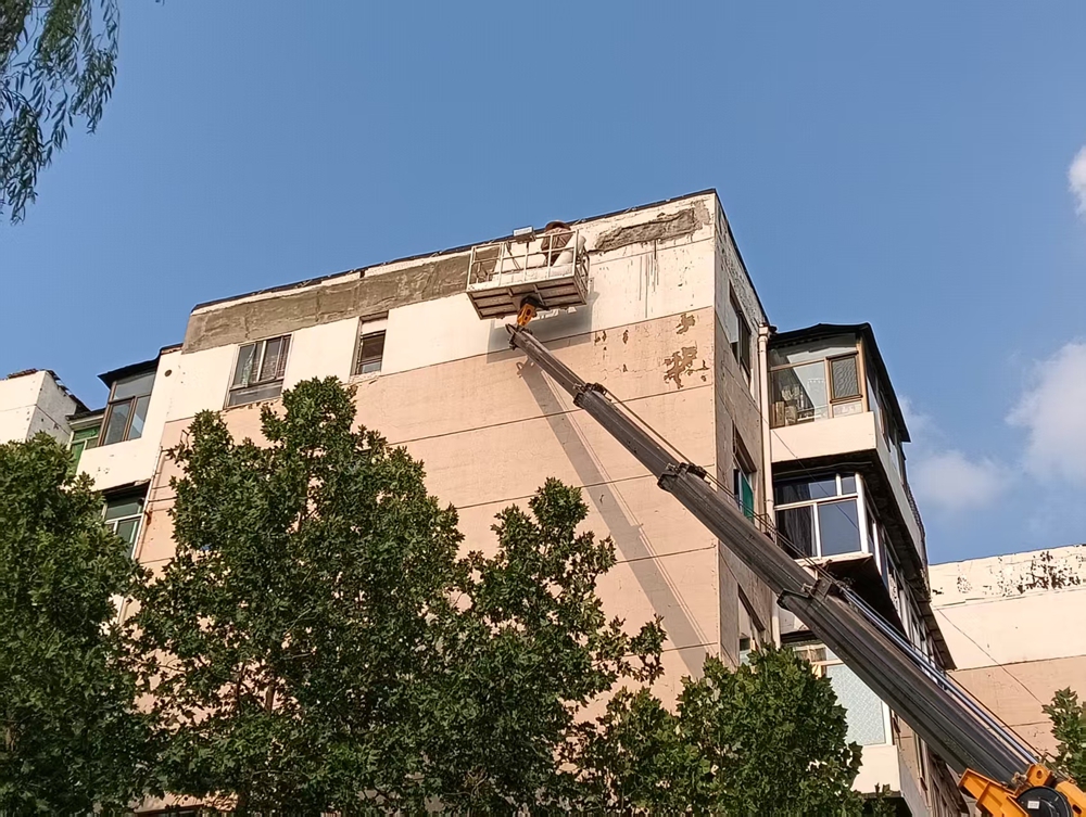 7月12日,华旺公司修缮人员抵达现场后,由社区网格员做好周边车辆及居民疏散工作,工作人员开展了墙皮修复工作,施工过程中,工人师傅们系上安全绳随着缓缓上升吊车到到达顶楼,仔细铲除松动的墙皮,并对破损的墙面进行修复,经过一天半的时间,彻底消除了“悬”在居民头上的安全隐患。