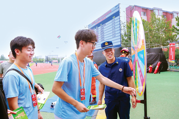 开幕式当天,运动场入口处的消防宣传区吸引了众多同学的关注。在这里,宣传人员精心设置了答题闯关、幸运抽奖、收集盖章等趣味互动环节,同学们可畅游其中,放松比赛中紧绷的神经,在不知不觉中将灭火逃生技巧牢记心间。