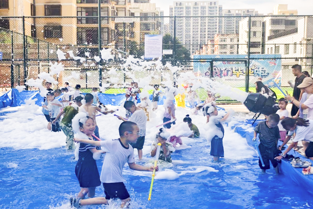 活动现场,蓝色水池铺满场地,泡沫机持续轰鸣,不断吐出绵密的泡沫。这些泡沫如云朵般倾泻而下,瞬间为现场营造出梦幻的氛围。孩子们难掩兴奋,纷纷冲进这片“水世界”,手持喷水枪相互“对战”,水花在半空中绽放,如同一朵朵“烟花”,童真在飞溅的水珠中尽情释放。
