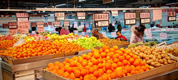 楼上的超市里,顾客穿梭在不同的货架间。黄瓜1.58元/斤,西红柿1.98元/斤,砂糖橘3.98元/斤,紫皮土豆1.28元/斤,平菇1.99元/斤,莴笋1.98元/斤……不少蔬菜瓜果都远低于市场价,吸引市民前来抢购。除了常见的蔬果,也有南方的菱角、荸荠在售。还能看到儿时喝的橘子粉,一元一包的老式油茶。不仅物美价廉,而且品类丰富多样。年节临近,漂亮的礼盒和大瓶大袋的量贩装也都是年货新选择。