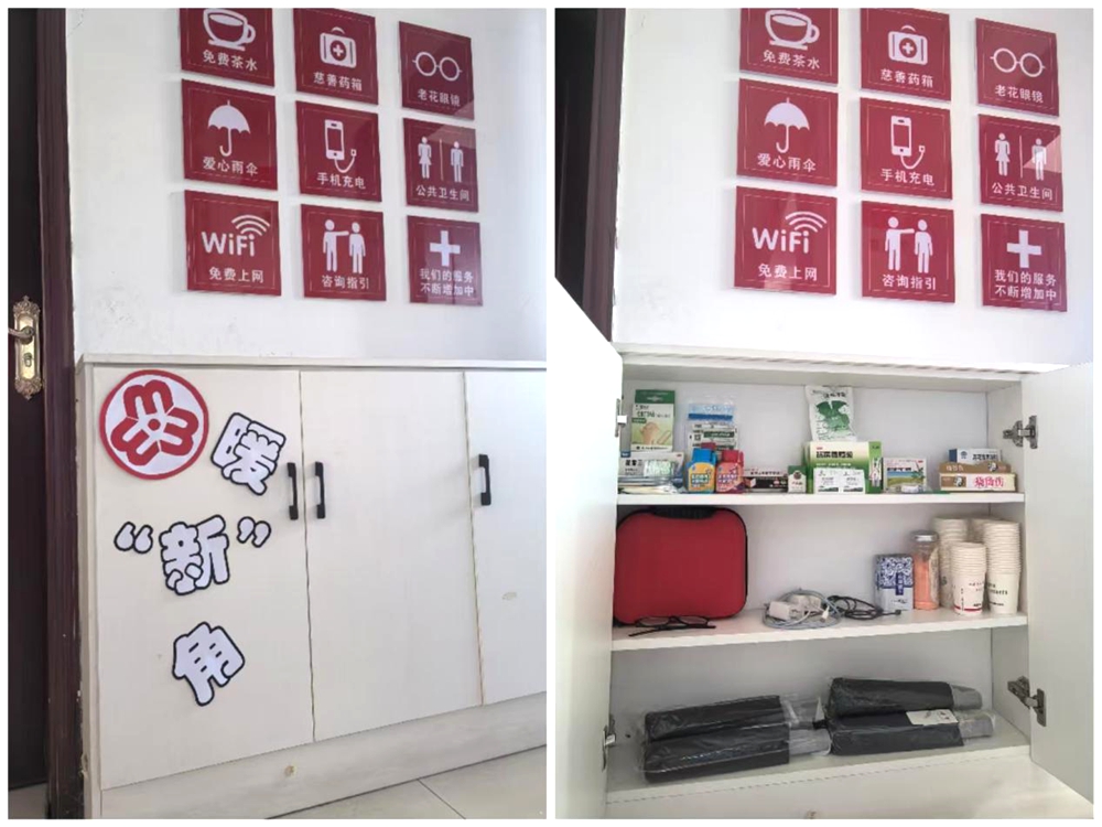 “暖新角”的选址藏着巧思,稳稳占据社区一层进门右侧的“黄金C位”,不用多走一步路、不用绕半分弯路,工作人员推门即可走进这片暖心天地。角内虽不大,实用设施却一应俱全:手机充电器随时待命,化解户外作业时的“低电危机”;爱心药箱里整齐摆放着创可贴、退烧药等常用药品,为突发不适撑起“防护伞”;备好的爱心雨伞则静静等候,在雨雪天气里为大家遮护出行路。这些看得见、摸得着的细微服务,精准踩中了“三新”组织工作人员在忙碌间隙的需求点,让他们在歇脚片刻就能感受到“社区如家”的温暖。