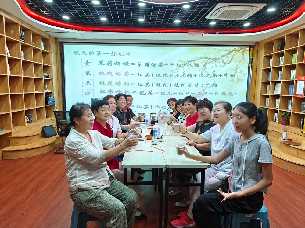 在平潭街街道商圈党群服务中心的活动现场,志愿者首先讲解了立秋节气的相关知识,让居民们更加深入地了解这一传统节日的文化内涵。随后,在经过“摊鸡蛋”“喜福气”暖场游戏后,志愿者带领居民开始自制“秋天第一杯奶茶”。将早已准备好制作奶茶所需的茶叶、牛奶、红糖等材料有序摆放,从选择茶叶、牛奶的搭配,到甜度的把控、调味的技巧,每一个细节都清晰呈现,大家根据不同的口味自由搭配小料。浓郁的茶香和鲜牛奶相互碰撞,大家边喝奶茶,边拉着家常,现场充满了欢声笑语,温情满满。