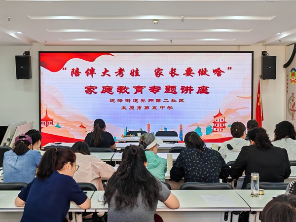 文明山西网讯 5月27日,太原市迎泽区迎泽街道并州路二社区联合太原市第五中学和山西博源家和心理健康有限公司开展“家有考试娃 爸妈该干啥”家庭教育讲座,特邀山西师范大学校外硕士研究生导师、国家二级心理咨询师乔莉主讲,辖区50余名家长到场聆听。