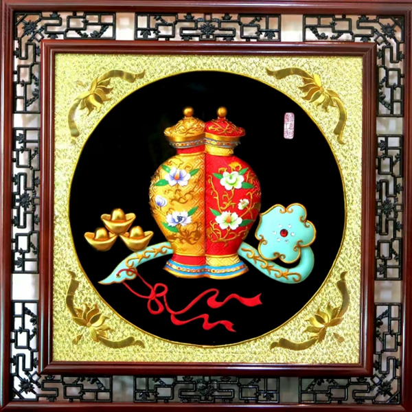 交城堆绫历史悠久,其工艺以“堆、绣、贴、缀”为核心,通过多层绫罗绸缎的堆叠、剪裁与刺绣,呈现出立体饱满的图案与细腻丰富的肌理。作品题材多取材于山水花鸟、民俗故事,既蕴含传统美学的雅致韵味,又承载着山西民间的生活智慧。