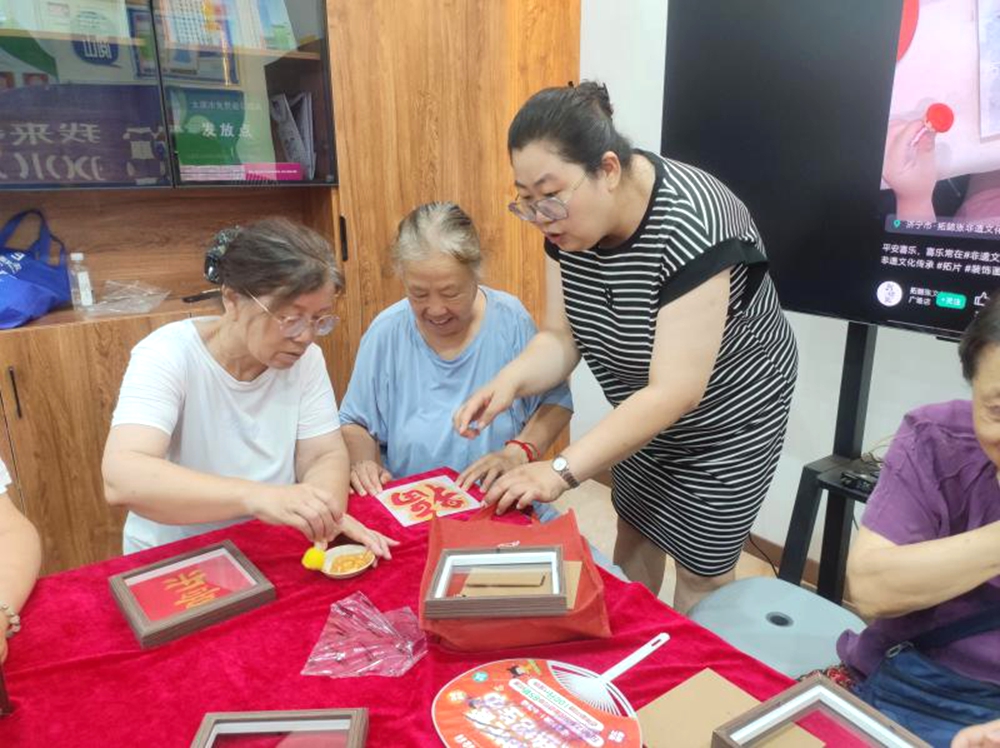 在详细讲解了拓印画的制作方法与技巧后,大家在志愿者的耐心协助下,纷纷开始了自己的创作之旅。他们灵巧地蘸取颜料,用海绵印章在布料上按压出一个个生动的图案和文字。在创作过程中,大家相互交流心得,彼此鼓励,现场充满了欢声笑语。张阿姨在创作完成后开心地表示:“这次活动真的很有趣,让我有机会亲手制作漂亮的祝福字画。看着自己完成的作品,我感觉自己也能创造美,心里特别有成就感。”