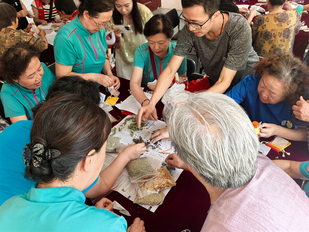 活动的最后,是充满趣味的香囊制作环节。志愿者们提前准备好了艾草、薄荷、陈皮等香料以及各色布包。老人们围坐在一起,一边学习中草药知识,一遍按照自己防蚊、安神等各种需求将不同的香料填充至香囊内。不一会儿,一个个散发着清香的香囊就制作完成了。大家捧着自己亲手做的香囊,脸上满是成就感,小小的香囊不仅承载着驱蚊安神的实用价值,更传递着社区对老人们的关怀。