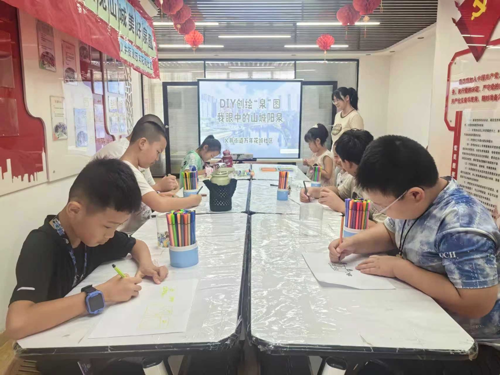 知识宣讲结束后,“我眼中的阳泉”DIY创意画活动热闹开启。孩子们拿起画笔、画纸等材料,将活动中了解到的阳泉元素——或是藏山的层峦叠嶂,或是娘子关的潺潺流水,或是非遗技艺的独特纹样,亦或是心中想象的未来阳泉模样,尽情挥洒在画纸上。一幅幅充满童趣与创意的作品,不仅展现了孩子们对家乡的独特理解,更寄托了他们对阳泉的热爱与美好期许。