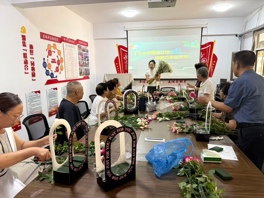活动当天,社区工作人员以简洁的“七夕传统速览”为引,简要介绍“牛郎织女”传说及穿针乞巧等习俗,快速带老干部们走进七夕文化氛围,随即转入本次活动的核心环节——插花体验。
