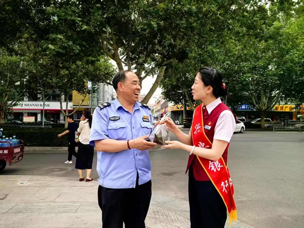 活动当天,高平支行工作人员早早准备就绪,将一份份包裹着红枣、豆沙的清香粽子,以及矿泉水、防暑用品等物资,亲手递到环卫工人、交通警察、快递小哥、外卖骑手等户外工作者手中,并向他们致以节日问候。“天气这么热,还惦记着我们,粽子吃在嘴里,却暖在心里!”一位环卫工人感动地说。