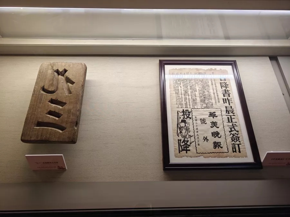 李俊杰馆长担任了首场展览的讲解,在“烽火晋城”展厅向参观群众讲解一块格外抢眼的特殊木板,木板上刻有“九三”两字,背面有握手手柄,高33厘米,宽18.5厘米。因它是代表世界人民查封日军侵略者军火库、粮仓、机库等大型军事设施及场所使用的印章,上面刻有“九三”两字,具有“国威世威”的严肃性,所以称之为“九三国封大印章”。这枚大印章,是中国人民抗日战争暨世界反法西斯战争胜利的实物见证,它与众不同之处在于体积硕大,历史意义特殊而深厚。一是体现抗日战争胜利的艰苦卓绝、来之不易;二是体现当时民众扬眉吐气的喜悦心情;三是代表长久和平,营造了全国放假三天的浓厚氛围。另外,在大印章旁边,还陈列了一张民国三十四年(1945)九月三日《华美晚报》号外,上面有特别醒目的“日降书昨晨正式签订”大字标题新闻报道。公章与文字报道更显现出设计师对历史文化的严谨态度。