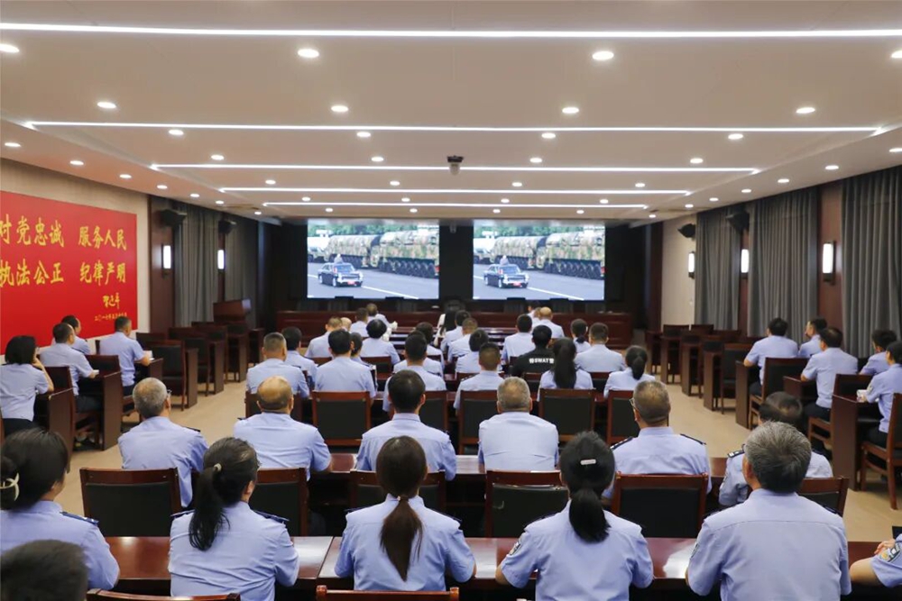 观看过程中,民警辅警神情庄重,目光紧紧聚焦在屏幕上,全神贯注地观看阅兵式的每一个环节。阅兵式上整齐划一的受阅方阵、先进精良的国防装备,一次次引发民警辅警的强烈共鸣。