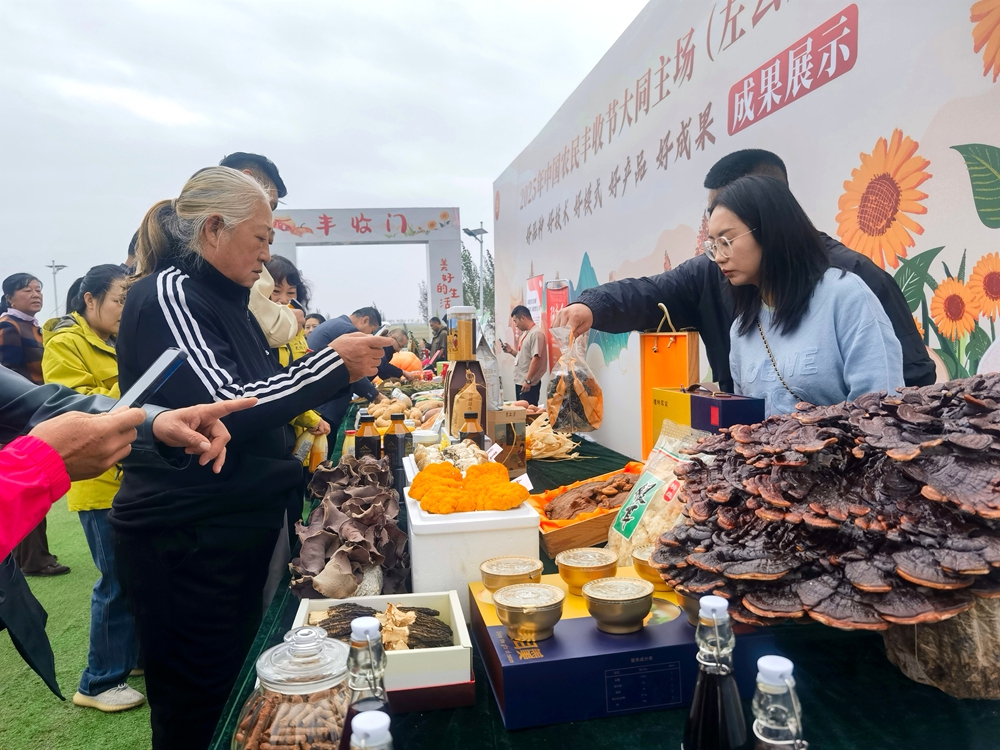 活动现场,“大同好粮”丰收大集展销了“大同好粮”“大同黄花”“恒山黄芪”“左臻云品”等大同区域公用品牌农产品、非遗文化产品、地方特色美食产品。52家大同农业龙头企业带来的黄花酱、有机菜、阳高杏脯、云冈白酒、左云沙棘汁、云冈牧同乳品、浑源黄芪、广灵小米等300多种产品,观众排队品尝并购买,反响热烈。重瓣玫瑰茶、太空观赏南瓜、黄花叶收纳筐、高粱杆餐垫、玉米皮枕头、果蔬酵素产品等特色成果区亮点纷呈,吸引大量参会代表、游客驻足观看体验,特别是重达 200 多斤的特大南瓜,成为了大家排队打卡拍照的“香饽饽”。