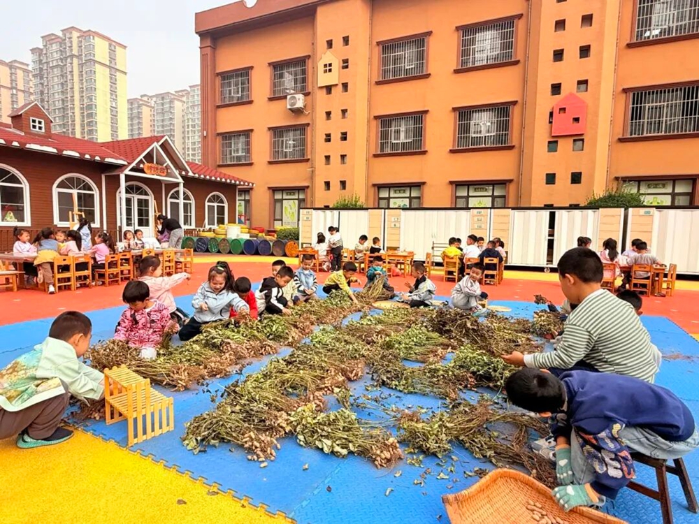 饱满的粒粒花生在幼儿手指间穿梭,一颗颗摘放到晾晒簸箕中,争先恐后,总怕漏掉一粒花生,相互间分享着自己的成果。有的端着送到土灶台烹饪,有的送到超市买卖、还有晾晒等,体验劳动的快乐、渗透爱惜粮食的理念,通过游戏联动增强生活经验。