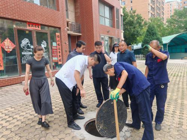文明山西网讯 近日,太原市小店区黄陵街道农南一社区网格员巡查时发现龙城新居一期小区内积水无法排出,已逐渐流入小区配电室,令人忧心。物业公司检查小区内排水设施后发现小区排水管网与市政主干道衔接处发生堵塞,积水倒灌、小区路面成河,居民出行极不方便,于是网格员跟社区及黄陵街道进行了上报,街道王书记闻讯后,迅速行动,和社区书记、小区物业经理、包村领导一起勘查了现场,果断拍板,即刻联系由市政、地铁等多部门负责人现场办公,集结会诊,找到具体原因,打通‘堵点’。