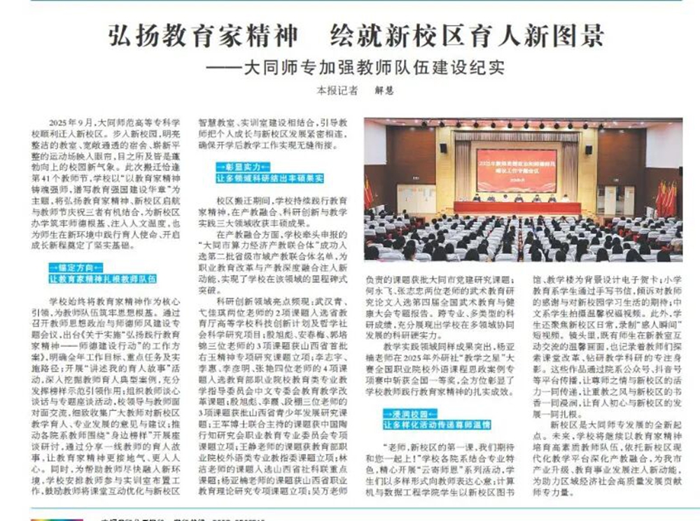 马克思主义学院、中文系、计算机与数据工程学院、数学系、学前教育系、体育系等依托学校官网、微信公众号等渠道,分别以“铸魂师声”“师者心语”等为标题推送教师事迹报道,聚焦教师在教育教学、科研攻关、师德师风等方面的经历与贡献;小学教育系、计算机与数据工程学院、学前教育系、外语系等依托短视频平台,围绕教师日常工作暖心片段、师生互动温情场景等制作并推送“感人瞬间”短视频,用直观影像捕捉教师工作闪光时刻;党委教师工作部同步推进多元化宣传,推出“讲述我的育人故事”微视频,在学校官网开设“教育家精神万里行”专栏,在文明山西网、新黄河、上游新闻、《大同日报》等媒体平台刊发该校弘扬教育家精神的实践经验。这些多元宣传举措,从多维度立体勾勒出教育一线风貌,不仅传递了尊师风尚,更展现了新校区的办学理念与发展活力,让“尊师重教”与“新校启航”的声音同频共振。
