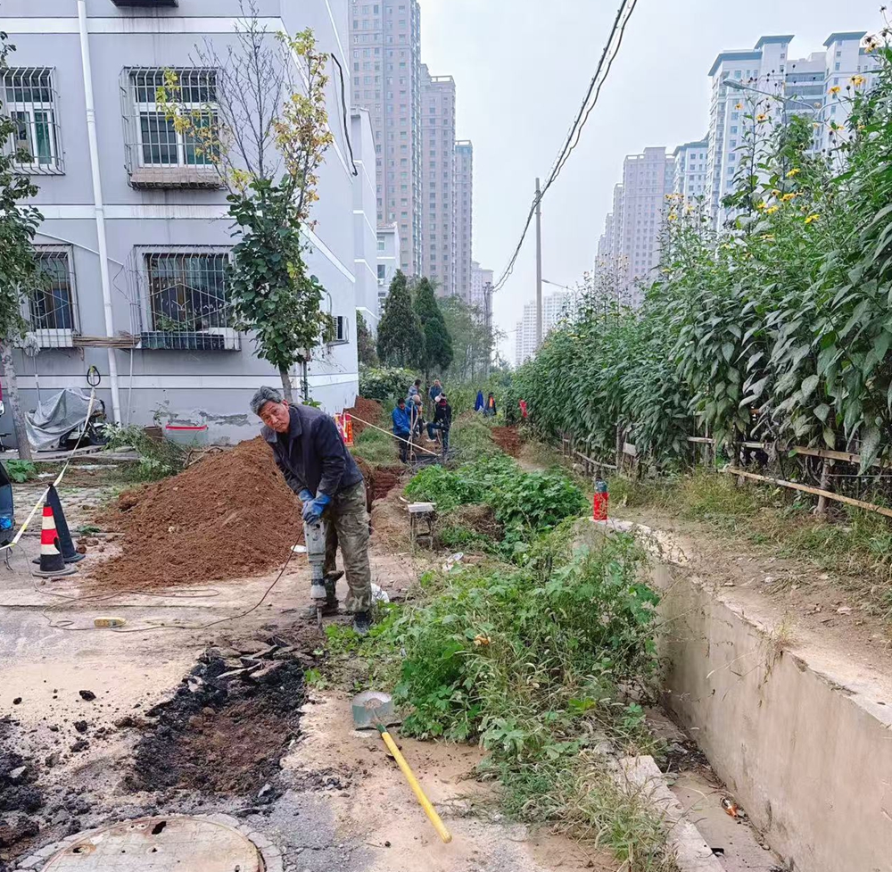 阳泉市高新区桃源社区新时代文明实践站安达志愿服务队在日常巡查中发现该问题后,立即联合辖区宇腾物业启动应急响应机制。双方迅速组建工作小组,对小区内所有排水管网进行全面排查,精准锁定塌陷管道位置,同时分析问题成因——受采煤沉陷区土壤特性影响,雨后土壤结构稳定性下降,最终导致部分管道出现塌陷。