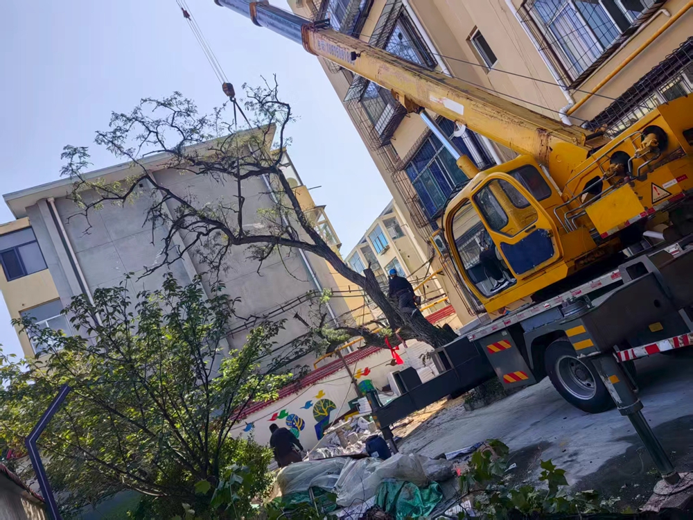 由于倾倒树木体型较大,处理工作存在一定难度。施工当日,社区工作人员临时对小区部分区域进行短时封闭,专业人员操控着吊车,谨慎作业,对树木进行了修剪和砍伐;社区工作人员则在现场维护秩序,引导居民安全通行。经过四个多小时的紧张作业,现场的树干、树枝得到妥善处理,安全隐患彻底消除。“这些树干歪歪扭扭的,看着就担心,现在砍掉了,走路都踏实多了!”居民王大爷连连点赞道。