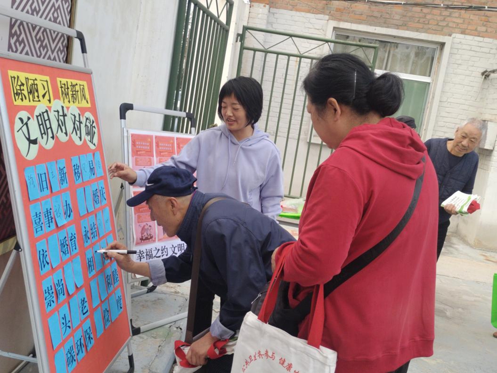 除了趣味互动,文明志愿者还自制了宣传展板,以“幸福之约·文明相伴”为主题,通过生动的图片和通俗易懂的文字,向居民普及婚事新办、喜事简办的理念,让居民直观了解了文明婚俗的重要意义,进一步引导居民自觉抵制高价彩礼、大操大办等不良风气,弘扬勤俭节约、健康向上的生活方式,有的居民还现场分享了自家“婚事简办”的经历,引得大家连连称赞。