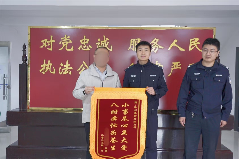 10月21日上午,张某专程来到南村派出所,送上一面写有“小事尽心显大爱 八时奔忙为苍生”的锦旗,对社区民警扎实的群众工作和高效的处置能力表示肯定。