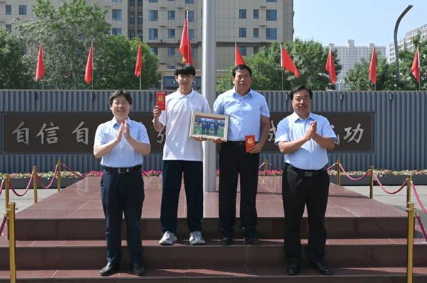 为表彰陈骏安同学所取得的优异成绩,并感谢金牌教练齐富德老师在其成长道路上倾注心血、做出的卓越贡献,6月2日,2025届高三学子在母校的最后一次升旗仪式上,举行了隆重的表彰活动。校长郭波平、书记杨宝钧向齐富德老师和陈骏安同学送上制作的纪念相片及饱含祝福的现金红包。主楼前广场上掌声雷动,这是对奋斗者的最高礼赞,亦是对实验中学体育育人精神的生动诠释。