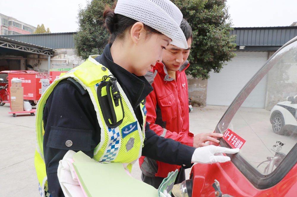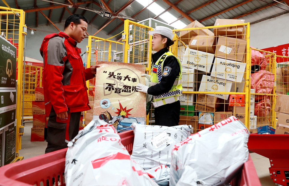 活动中,宣传辅警针对冬季道路通行特点,通过张贴安全宣传挂图和交通安全倡议书、粘贴安全即时贴、发放印有安全提示标语的手提袋、面对面宣讲的方式,针对快递行业日常出行特点,以“一盔一带”安全守护行动为主题,深入浅出地讲解安全行车注意事项,并结合快递配送人员以三轮电动车为主要交通工具的特点,对于部分快递员在送货过程中存在有频繁出现随意变道、逆行、闯红灯、疲劳驾驶、分心驾驶等交通违法行为进行警示,告诫骑手们不能只为看经济效益而盲目求“快”,强调“安全就是效益”的理念,提醒快递员在追求配送效率的同时,务必时刻将交通安全放在首位。