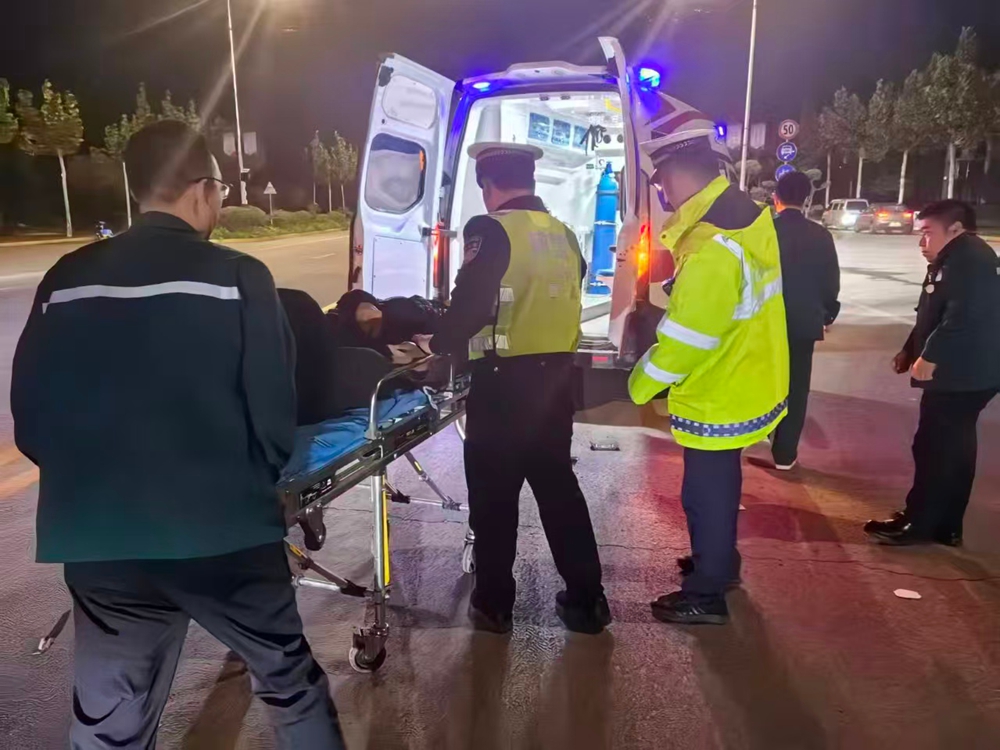 医护人员和事故民警抵达现场后,民警协助医护人员将伤者抬上救护车,并交接好现场情况,随后继续开展道路巡查。