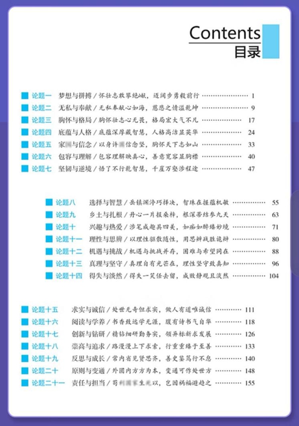 全书摒弃了晦涩的理论说教,采用“问题导向+案例拆解”的模式,将议论文写作的核心环节——论题、论点、论据、论证——拆解为可操作的步骤。精选“梦想与拼搏”“胸怀与格局”“底蕴与人格”等涵盖个人成长、价值理念、家国情怀等维度的核心关系命题;各论题内部,依照“论题解读—布局谋篇—论点举例—论据积累—论证训练—例文指路”的逻辑框架,层层递进展开内容。