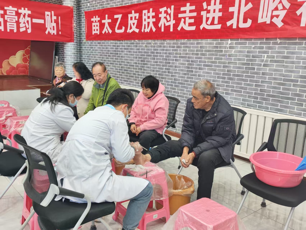 活动当天,苗太乙皮肤科提前调配专业技师团队,携带中药泡脚包、修脚工具等物资,搭建起整洁有序的临时服务区,划分接待登记、温水泡脚、皮肤病诊疗、健康咨询四个功能区域,确保活动高效开展。在皮肤病诊疗专区,专业医师携带诊疗设备,细致为居民皮肤状况,针对脚气、灰指甲、湿疹等常见皮肤病,提供一对一诊断建议,开具个性化护理方案,并现场普及皮肤保健知识,提醒居民注意日常卫生习惯与防护要点。泡脚修脚区则人气满满,技师先为居民用特色药液泡脚舒缓疲劳,再细致开展去死皮、修趾甲等护理服务,同时讲解足部保健技巧,如适宜泡脚水温、日常护足要点等。