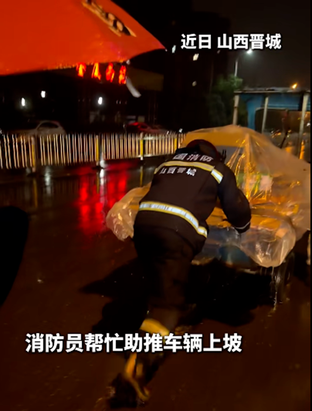 在上坡路口,消防员默默为三轮车助推的那一把力;在上坡路口,消防员默默为三轮车助推的那一把力。