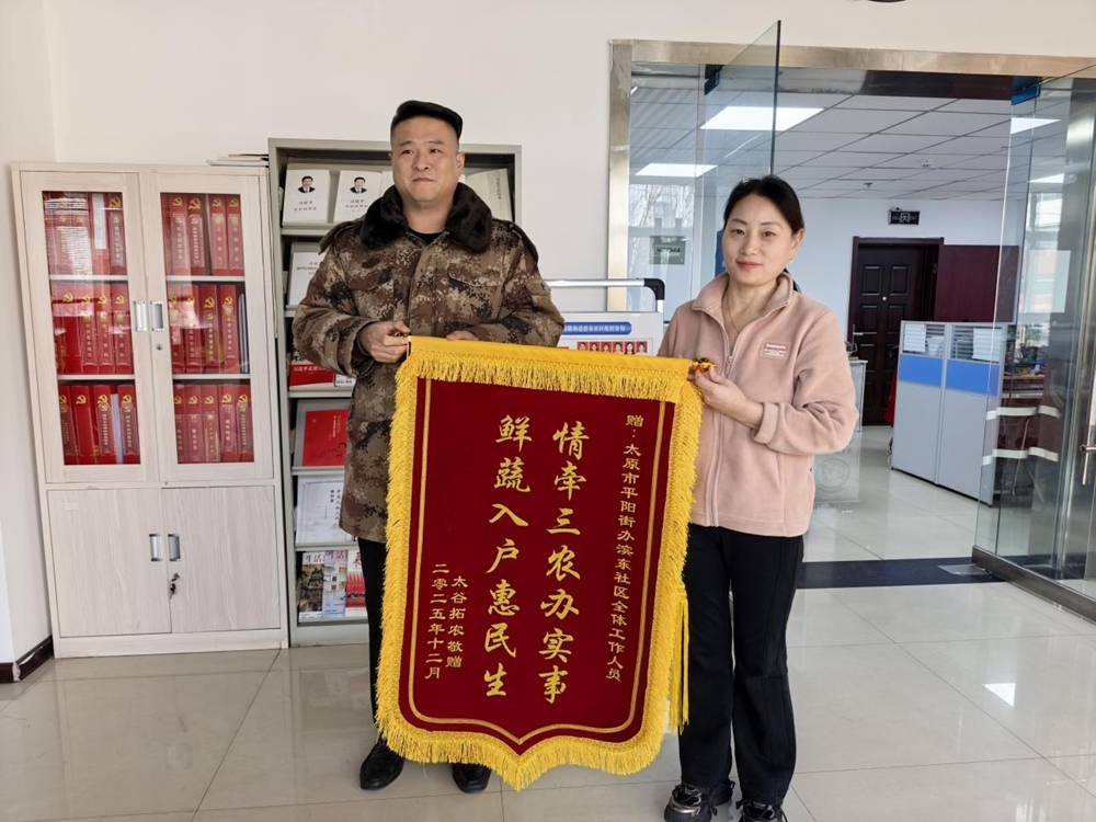 文明山西网讯 12月9日,太原市小店区平阳路街道滨东社区新时代文明实践站收到一份特别的礼物,来自太谷拓农蔬菜批发配送中心的一面鲜红锦旗,上面金灿灿地写着:“情牵三农办实事 鲜蔬入户惠民生”。这面锦旗不仅代表着企业对社区工作的认可,更是对不久前那场有声有色的惠民助农活动的最佳注脚。