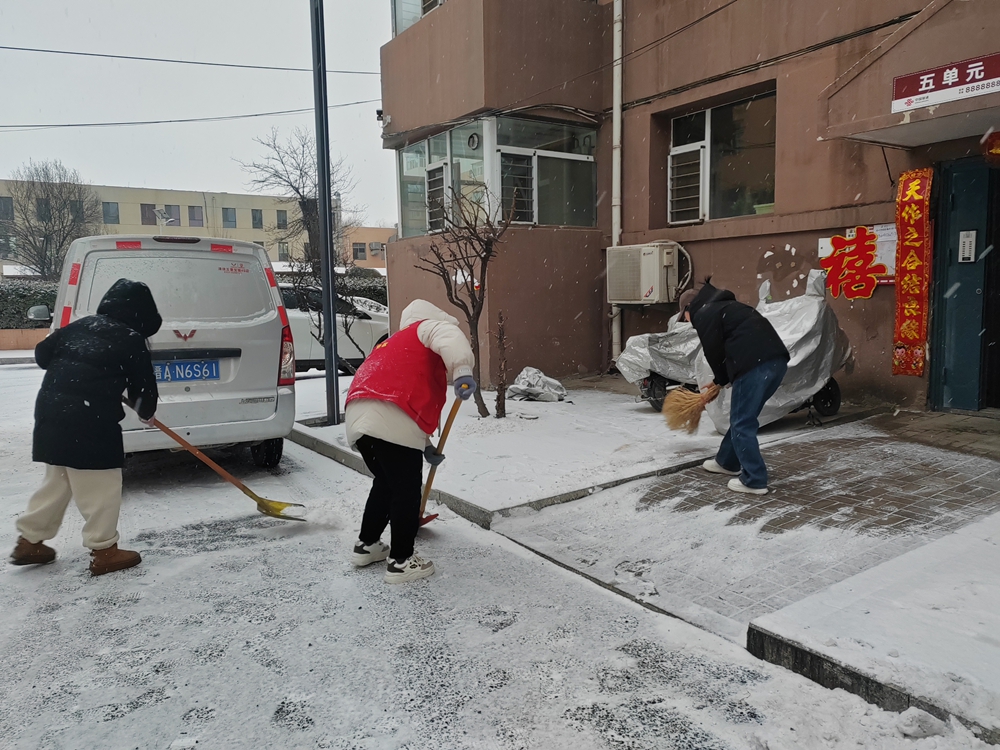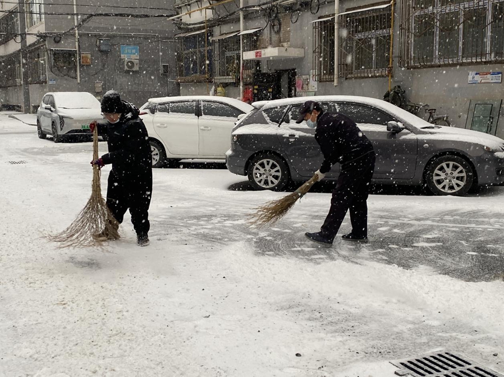 经过两个多小时的奋战,小区内的主干道、单元门口的积雪被清理得干干净净,露出了整洁的路面,为居民们开辟出了一条条温暖的“平安路”。