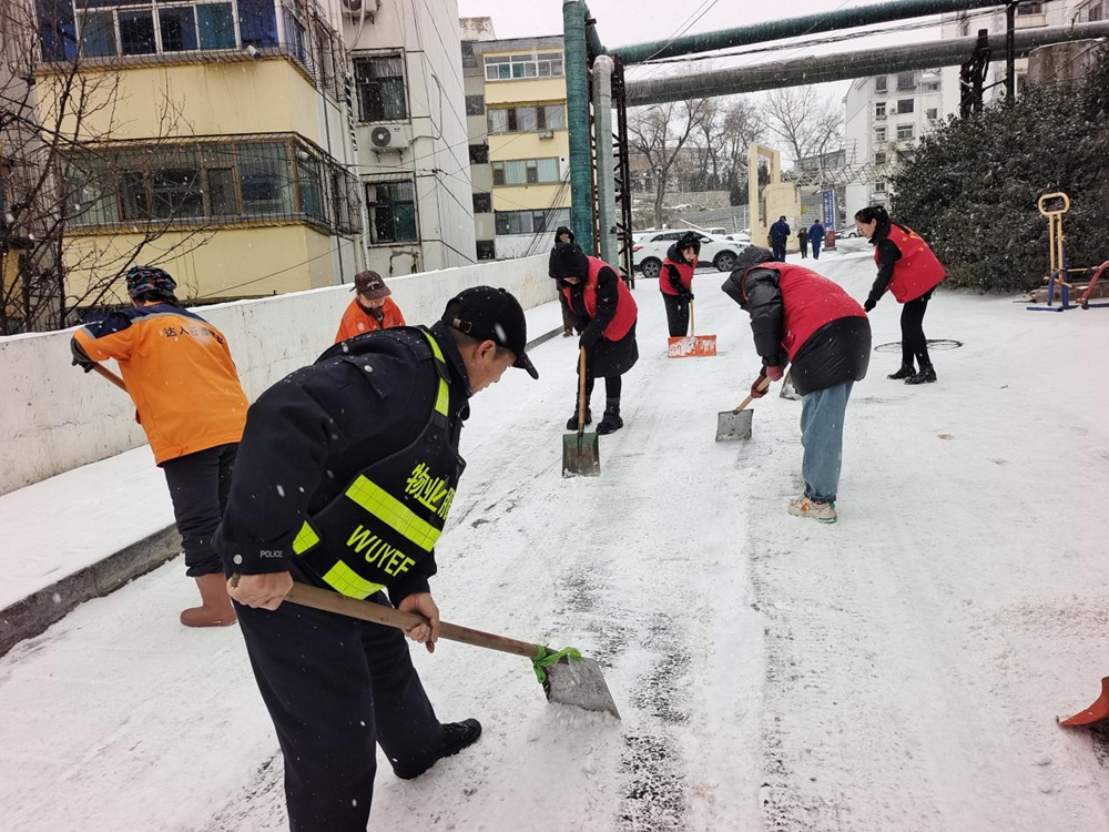 清雪现场,身着红色志愿服的社区工作者、蓝色备勤服的消防员、橙色工作服的物业人员各司其职、默契配合,构成了雪地里一道靓丽的“三色风景线”。“阿姨,雪天路滑,您别急着出门,要是需要买东西,随时给我们打电话!”社区网格员一边清扫积雪,一边不忘叮嘱网格里的独居老人。消防员则弓腰低头,握着雪推的木柄在雪地里稳稳向前推送 ,积雪被宽大的推板拢过,原本埋在雪下的水泥路面瞬间露出深灰的底色。物业工作人员则攥着扫帚柄,弓步俯身顺着路面横向扫动,积雪被扫帚裹挟往路边归拢,几名手持铁锹的师傅蹲身发力,将被车压实的积雪铲起抛向路边,不多时,原本覆着白霜的主干道便露出路面,往来的居民踩在上面,脚步都稳了不少。