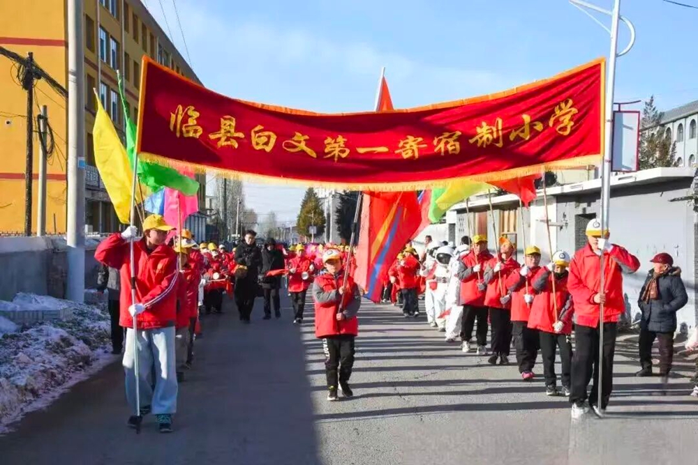 文明山西网讯 12月30日,借力新时代文明实践所与乡村学校少年宫结对共建的强劲东风,临县白文第一寄宿制小学在白文广场隆重举办“诵中华经典、展少儿风采”迎元旦主题活动。全校师生齐聚一堂,以传统秧歌游行、创意集体排字、经典篇目诵读、特色文艺展演等多元形式,辞旧迎新、礼赞文化,为冬日的校园与乡村增添了浓浓的喜庆氛围。