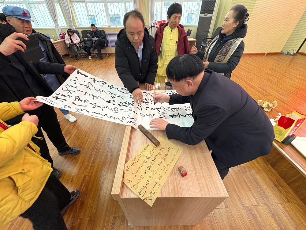 宋振太的笛子独奏《山丹丹开花红艳艳》,笛声清脆嘹亮,婉转悦耳。演奏之余,他还现场展示毛笔书法,笔走龙蛇间,尽显传统文化魅力,让观众大饱眼福。