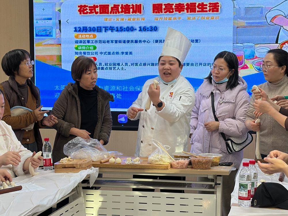 文明山西网讯 12月30日,太原市迎泽区老军营街道零工示范站二楼,空气中飘散着面粉的甜香与蒸笼的蒸汽——这里正上演着一场热气腾腾的“面点真人秀”。20余位居民围着操作台,从“厨房小白”变身为跃跃欲试的“面团学徒”。此次活动由太原市迎泽区人社局、公共就业服务中心与街道共同发起的“花样面点培训”,把技能课堂变成了居民院落的烟火日常。