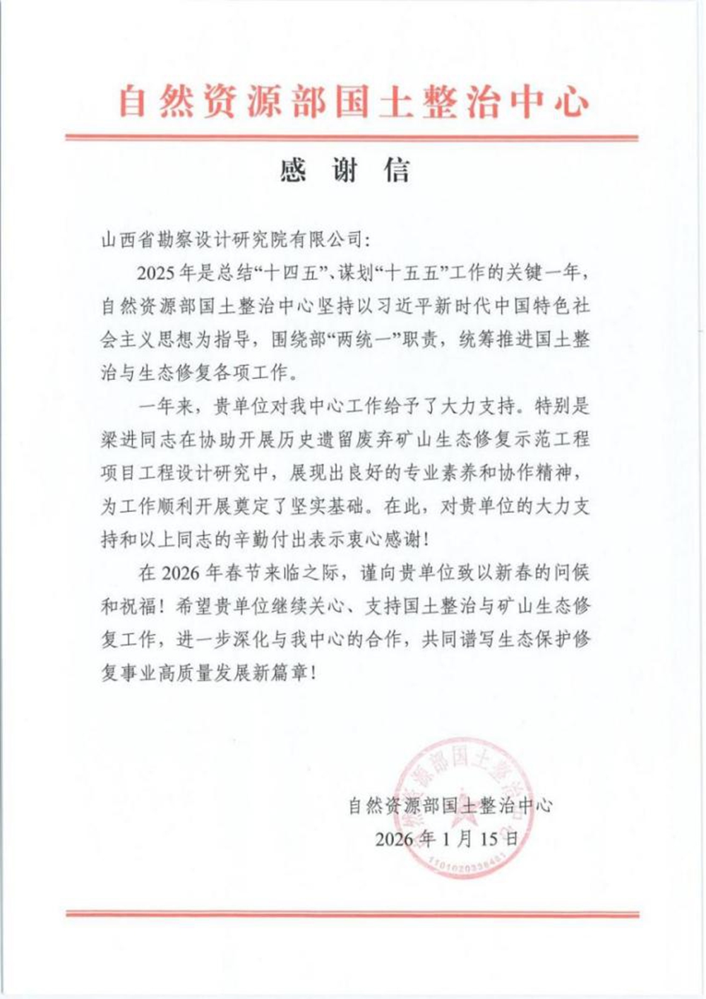 文明山西网讯 近日,山西省勘察设计研究院有限公司收到来自自然资源部国土整治中心发来的感谢信,信中对公司在国土整治与生态修复工作中的大力支持致以诚挚谢意。
