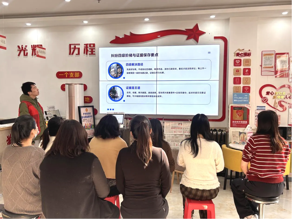 培训最后,志愿者介绍了“协商—调解—投诉—诉讼”纠纷四级解决路径,强调了证据保存的重要性,提醒工作人员在日常工作中注重收集现场照片等材料,为居民群众维权提供支持。“这次培训全是干货,让我对各类纠纷的处理思路更加清晰,以后再面对居民漏水纠纷调解、遗嘱咨询解答等工作时,也有了明确的法律依据和实操指引!”社区网格员刘若男深有感触地说道。