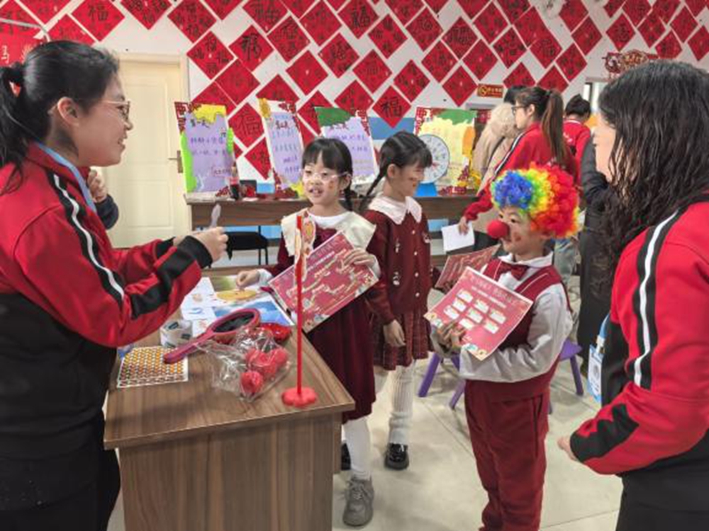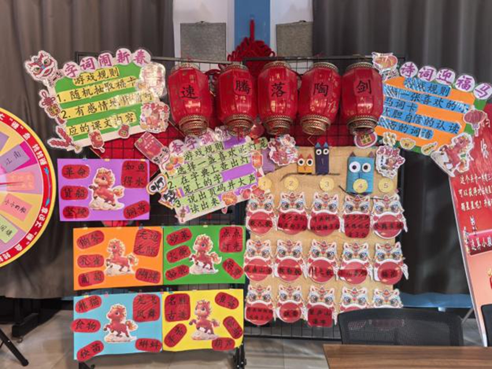 活动现场,党员教师、社区志愿者化身“闯关导师”,共同搭建起“骏马王国”的奇幻闯关场景。墙上错落有致的百“福”图、舞台前缤纷的气球拱门,营造出浓厚的节日氛围与乐学氛围。孩子们化身“闯关小骑士”,手持闯关卡,依次挑战“字词闹新春”“诗词迎福马”“科技探秘”等八大关卡:在语文关卡,他们转动诗词转盘、认读灯笼字谜,在传统文化浸润中夯实知识基础;在科技展台前,围着机器人认真观察互动,在趣味体验中激发科学探索欲;集体闯关环节里,孩子们整齐列队、高声欢呼,在团队协作中收获荣誉与成长。